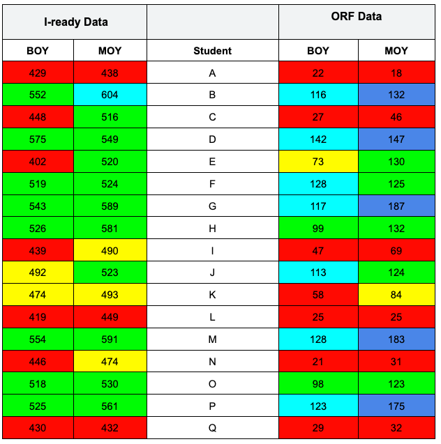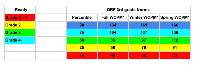 To understand the impact of instructional shifts in this third-grade classroom, student growth was examined using two complementary measures: the i-Ready Diagnostic, administered at the beginning and middle of the year, and Oral Reading Fluency (ORF) benchmarks collected in the fall and winter. Together, these data sources capture both overall reading achievement and the foundational fluency skills that support comprehension.